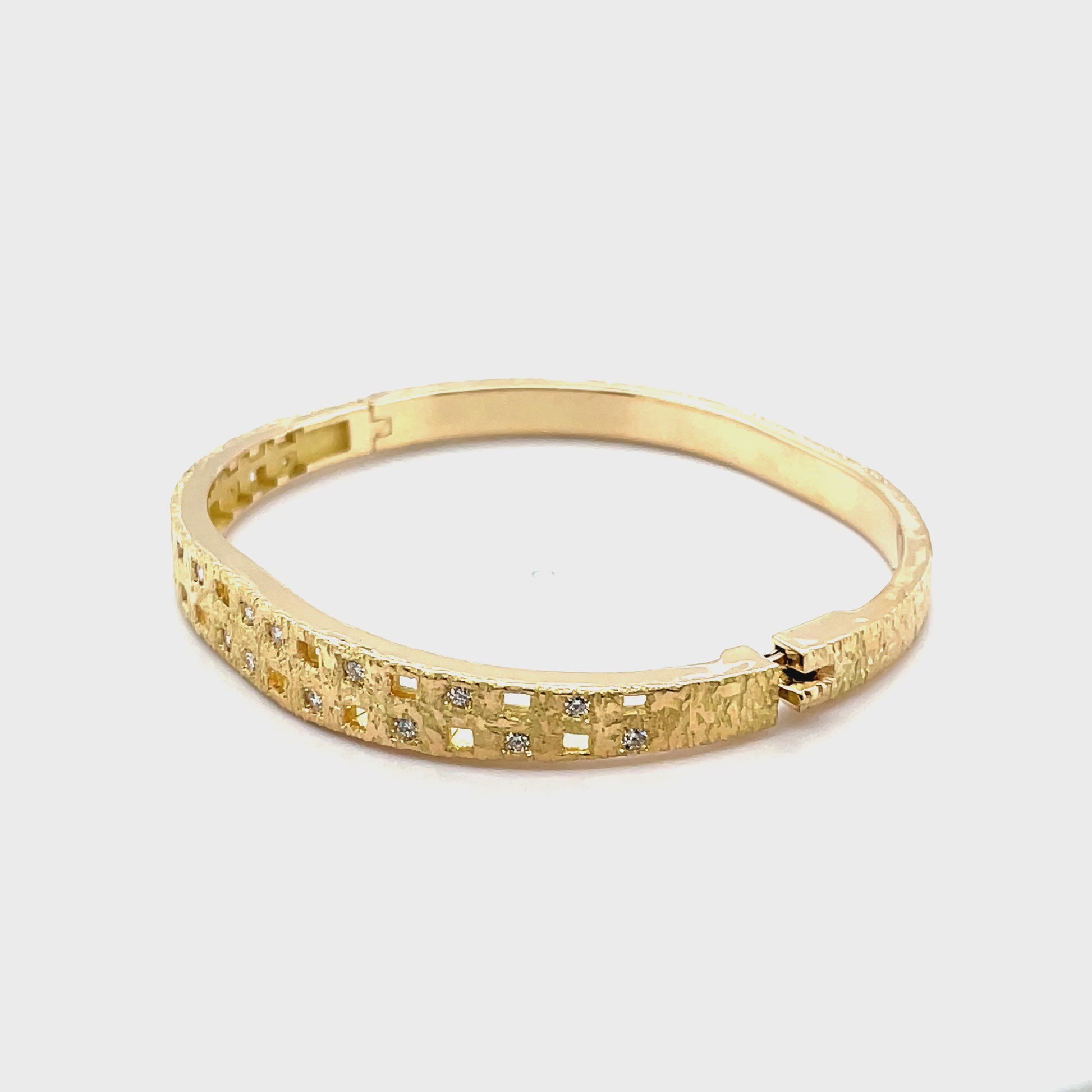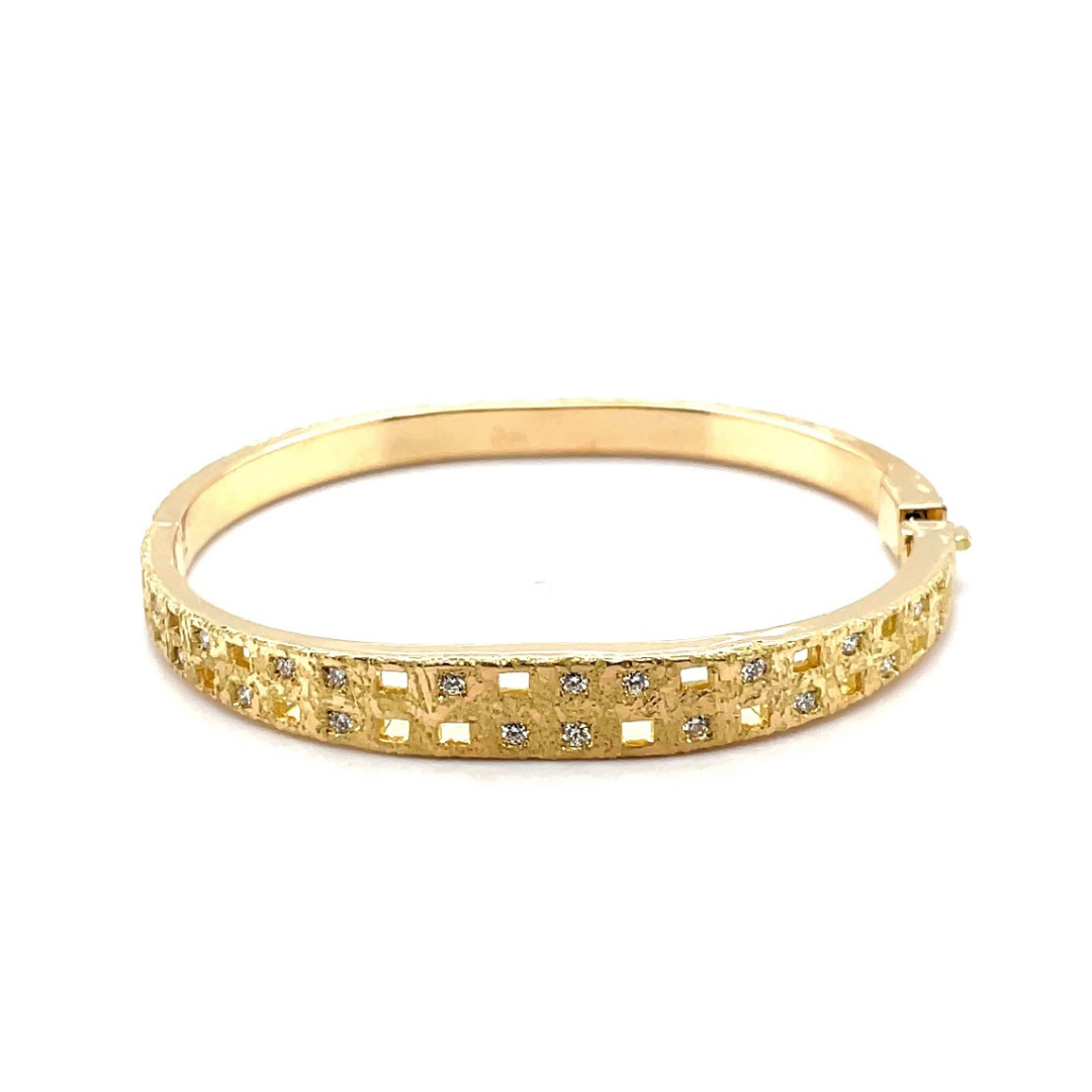 Ce bracelet en or jaune 750 est à la fois élégant et tendance avec ses formes géométriques complexes et discrètes qui cachent des diamants.