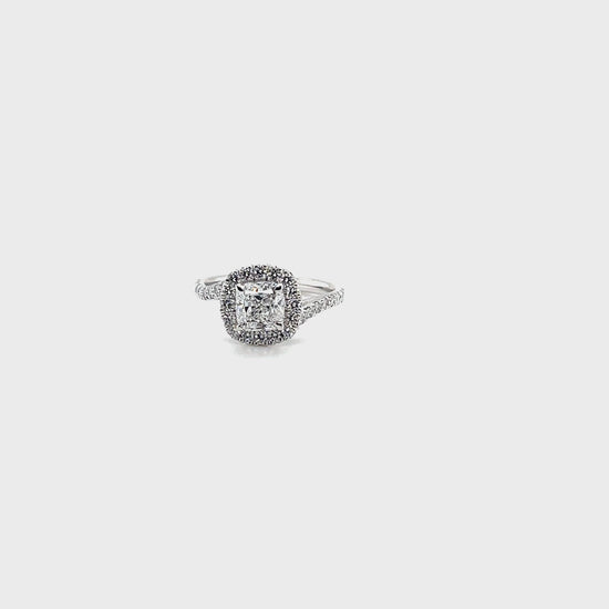 Ornée de diamants étincelants le long de la bande et entourant l'étonnant diamant en forme de coussin, cette bague ajoutera une touche éblouissante lors de vos galas